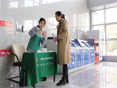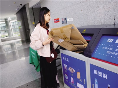 在经开区管委会大厅,一名员工站在智能回收柜前,轻点屏幕,纸类收纳箱的盒盖自动打开,她将几只纸箱投入,只听“滴答”一声,回收柜已自动完成称重。等盒盖关闭,她拿出手机在旁边的屏幕上扫了下二维码,已经查到了本次投放纸品的积分。根据积分,她可以自由兑换相应的商品或者服务券。
