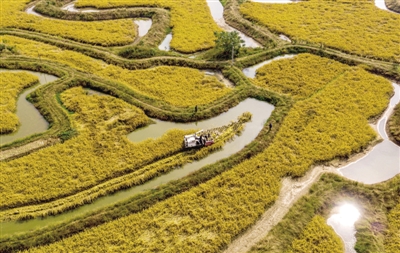 金秋时节,各地农民利用晴好天气加紧收割水稻,确保颗粒归仓。10月25日,在安徽省合肥市庐江县柯坦镇枣岗村,农民驾驶收割机收割水稻。 ■ 据新华社 左学长/摄