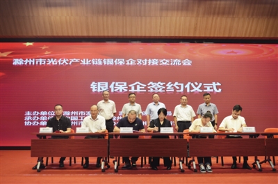 2021年9月17日下午,由滁州市发改委、滁州银保监分局主办的“光伏产业链”银保企对接交流会在滁举行。会上,相关银行、保险机构现场进行了金融产品和服务宣讲,同时与部分企业家进行了交流互动。其中,9家银行、1家保险公司与7家光伏企业现场签订了授信、合作协议,签约总额达23.33亿元。