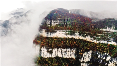 10月27日拍摄的龙头山旅游景区(无人机照片)。近日,位于川陕交界的陕西省汉中市南郑区龙头山旅游景区云雾缭绕,层林尽染,如火似霞的红叶点缀着连绵起伏的山峦,构成了一幅迷人的山水画卷。 ■新华社记者 陶明/摄