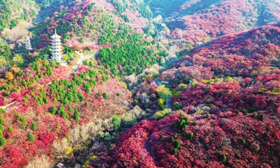 这是日前拍摄的济南市红叶谷风景区一景(无人机照片)。金秋时节,地处山东省济南市南部山区的红叶谷风景区层林尽染,秋色绚烂。 ■ 新华社记者 朱峥/摄
