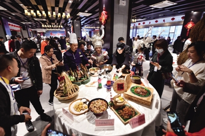 11月2日,参评企业的厨师在美食评比大会上展示“苗家丰收宴”。当日,广西柳州市美食联盟协会举办“舌尖上的乡村振兴”美食评比大会,以香鸭、香糯、莲藕、油茶等当地特色农产品为原料制作的200多道美食参加评比。活动旨在促进餐饮企业进一步将当地食材融入美食产业,助力乡村振兴。 ■ 新华社记者 黄孝邦/摄