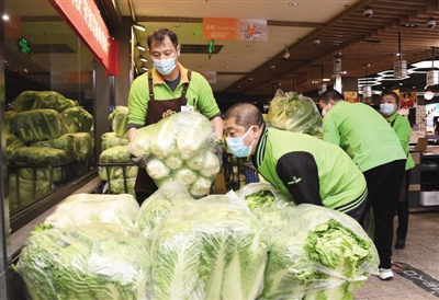 11月2日,在超市发双榆树店,工作人员在码放大白菜。当日,北京超市发连锁各直营店冬储菜上市。据了解,冬储菜采用产地直采的方式供应市场。在销售冬储菜期间,北京超市发连锁50家直营店每天将提供150余吨大白菜、30余吨大葱。冬储菜供应将持续至11月4日。 ■ 新华社记者 任超/摄