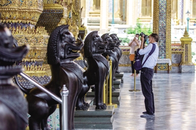 11月1日,一名游客在泰国曼谷大皇宫景区拍照。泰国曼谷11月1日起重新开放因新冠疫情关闭的大皇宫景区,允许民众在遵守防疫措施的前提下参观游览。 ■ 新华社记者 王腾/摄