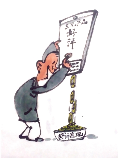 “好评返现”的目的,就是要以1元、2元这样的“小恩小惠”诱导消费者对产品作出非客观评价,让“好评返现”成为“三无产品”或者质量低劣产品的“保护伞”,用虚假的“好评”助“三无产品”、质量低劣产品蒙骗更多的消费者,在网售市场上畅通无阻。许多消费者,明知买了“三无产品”,或者发现收到的产品“货不对板”,已经上当受骗,无奈之下,只能接受“好评返现”,权当为自己挽回一点损失。但显然,这是贪小失大,因此让商家有恃无恐,“好评返现”必将更加泛滥成灾,也让更多的“三无产品”涌进网络销售平台。