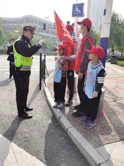 “叔叔,红灯停、绿灯行,请您停在禁止线内”“阿姨,您骑车的时候一定要戴头盔”……“小交警”们一个个神情专注、有模有样,大家运用刚刚学习到的手势,针对行人不走人行横道、闯红灯、非机动车越线停车等行为,引导市民遵守交通法律法规,认真开展文明交通劝导工作。不少违规违章者受到小志愿者精神的感染,表示今后一定遵守交通规则。