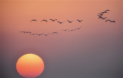 11月4日,一群候鸟从莫莫格湿地上空飞过。随着气温逐渐降低,在吉林省白城市镇赉县境内莫莫格国家级自然保护区栖息的候鸟陆续南迁。近年来,白城市实施河湖连通等多个生态工程,生态环境不断向好,每年春秋两季吸引包括白鹤、大雁、野鸭等在内的几十万只候鸟在莫莫格湿地停歇休养,补给觅食。 ■ 新华社记者 张楠/摄