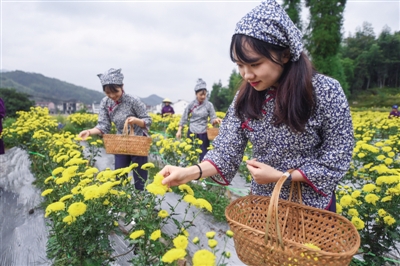 11月4日,在浙江省青田县阜山乡轩德皇菊基地,工作人员在采摘皇菊。近年来,浙江省青田县阜山乡依托盆地和梯田种植了1200亩皇菊,年产值3000余万元,吸纳了当地100余名村民就业。当地皇菊产业已经成了青田农旅融合发展、产业兴旺发展的一张金名片。 ■ 新华社记者 徐昱/摄