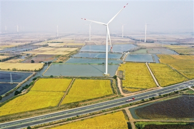 这是11月3日拍摄的江苏省扬州市宝应县鲁垛镇5.28万千伏安风力发电项目。近年来,江苏省扬州市宝应县利用地区优势,大力发展“风光渔”互补产业发电、风力发电等,形成上有风力发电、中有光伏利用、下有水产品养殖和稻田的立体开发模式,通过清洁能源,不断推动绿色低碳发展。 ■ 新华社记者 李博/摄