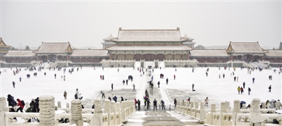 11月7日,游人在雪中游览故宫。11月6日起,受寒潮影响,北京出现持续降雪,掩映在雪中的故宫博物院别有韵味。■ 新华社记者 李欣/摄
