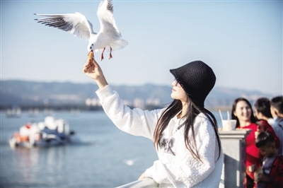 11月7日,一名女子在昆明市滇池海埂观景大道上投喂红嘴鸥。随着气温下降,成千上万的红嘴鸥从西伯利亚飞抵云南昆明越冬,成为“春城”昆明的一道美丽风景。■ 新华社记者 胡超/摄