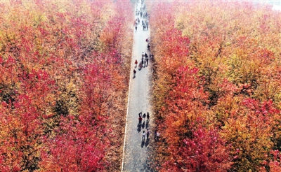 近日,青岛市西海岸新区张家楼街道千亩枫林披换“红妆”,进入最佳赏叶期,吸引众多游人慕名而来打卡赏景。近年来,青岛市西海岸新区将农林生产与文旅休闲相结合,打造出多个乡村旅游特色小镇,在促进生态保护的同时带动了当地乡村振兴与发展。 ■ 新华社记者 李紫恒/摄