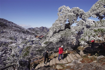 2021年11月8日,在安徽黄山风景区拍摄的入冬首场大面积雾凇美景。当日,受强冷空气影响,雨后黄山景区气温骤降,出现入冬首场大面积雾凇奇观,在冬日的辉映下,玲珑剔透,宛如琉璃世界,令游客流连忘返。