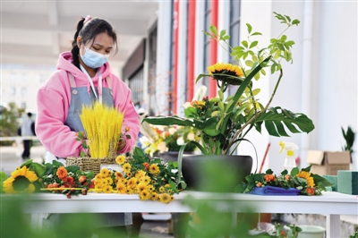 11月23日,参赛选手在参加艺术插花比赛。当日,2021年贵州省黔南州中等职业学校师生技能大赛暨贵州省职业院校技能大赛选拔赛(龙里赛区)举行。来自黔南州各职业学校的620余名参赛师生,分别就旅游服务、农林牧渔、加工制造、交通运输、文化艺术、财经商贸等类别进行现场实操比赛,展示职业教育的成果和风采。 ■新华社记者 杨文斌/摄