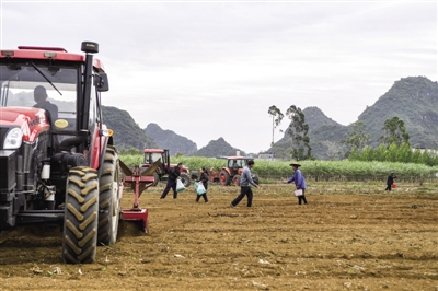 11月23日,在广西武宣县禄新镇地有村,村民在播种。近期,广西武宣县降水较多,之前的旱情得到缓解,当地群众抢抓农时开展冬种。 ■新华社记者 曹祎铭/摄