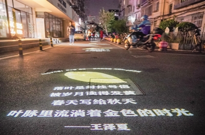 11月23日拍摄的“诗歌单行道”。今年10月,作为2021上海城市空间艺术季项目之一的“诗歌单行道”在杨浦区四平路1028弄点亮,长短不一的诗歌通过灯光投影在地面,点亮了居民的回家路。据了解,单行道投影灯每天下午5时亮灯,熄灯时间定在凌晨1时,诗歌内容定期更换,都是由本地居民创作。 ■新华社记者 王翔/摄