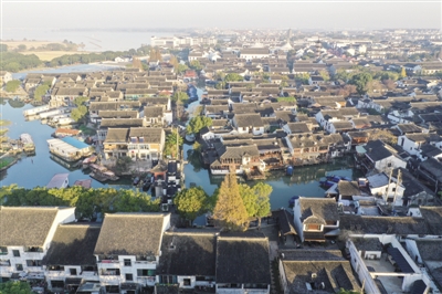 沐浴在晨曦中的周庄景色(无人机照片)。初冬时节,拥有近千年历史的“中国第一水乡”周庄在朝阳的照耀下,景色迷人,宁静祥和。 ■ 新华社记者 季春鹏/摄