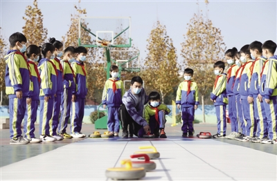 11月24日,邢台市立德小学教师在指导学生练习冰壶。近日,河北省邢台市襄都区立德小学开展“燃情冰雪,助力冬奥”校园冰雪节活动,通过创意刻纸、创意瓶盖画、打冰壶等形式,激发青少年参与冰雪运动的热情。■ 新华社发 张驰/摄