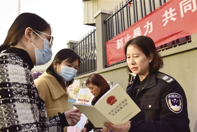 11月24日,在合肥市蜀山区井岗镇金湖社区,井岗镇司法所和妇联联合开展“制止暴力,共同呵护爱的港湾”法律宣传活动,司法所工作人员和妇联工作人员为居民介绍预防家暴的相关知识。