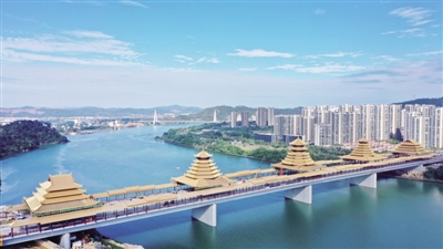 这是11月24日拍摄的柳州凤凰岭大桥(无人机照片)。近日,广西柳州市凤凰岭大桥进入施工冲刺阶段,工人们正加紧施工,即将完成铜瓦铺设的大桥仿佛披上一层金色的外衣,成为柳江上一道靓丽风景。 ■ 新华社发 黎寒池/摄