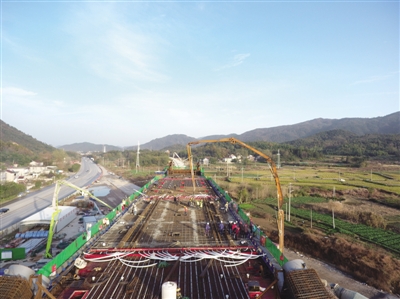 星报讯 11月23日凌晨,由中铁十一局承建的池黄高铁白沙铺特大桥跨G318国道1-128米系杆拱桥首段完成混凝土浇筑,标志着池黄高铁池州段控制性节点工程取得重大突破。据现场施工负责人介绍,该系杆拱桥采用“先梁后拱”法施工,系梁采用支架现浇,拱肋钢管采用工厂分节预制、现场拼装焊接然后灌注混凝土。现浇梁施工分5段浇筑,本次浇筑的节段为中间段1,设计长度27米,桥面宽度18.4米,混凝土设计量460方。