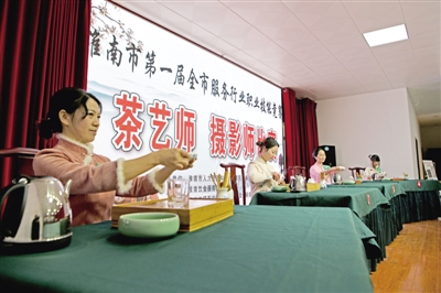 11月28日,淮南市各县区参赛选手在淮南市第一届服务行业职业技能大赛茶艺比赛中竞技。当日,由淮南市人力资源和社会保障局、淮南市总工会主办的淮南市第一届服务行业职业技能大赛开赛,72名选手分别参加茶艺师和摄影师两个行业比赛,大赛旨在提高服务行业劳动者技能,加强高素质技能人才队伍建设。