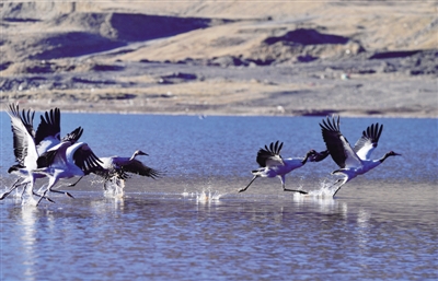 这是在林周县虎头山水库拍摄的黑颈鹤(12月7日摄)。近日,来到西藏拉萨市林周县的黑颈鹤已达1500只左右,这里成为黑颈鹤越冬的乐园。 ■ 新华社记者 张汝锋/摄