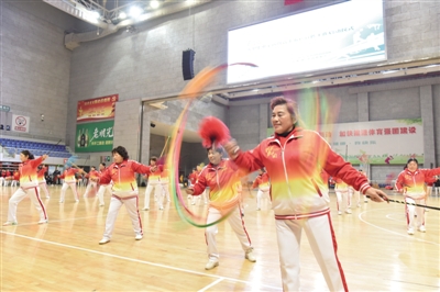 走进滁州市体育馆,记者看到有一些中老年人在练习柔力球和花棍。“打花棍的时候,身体每个部位都能得到锻炼,还能使左右脑都得到训练,提高协调能力和平衡能力。”滁州市老年大学健身花棍辅导老师詹友旺说,现在越来越多的中老年人加入锻炼队伍,当地全民健身氛围浓厚。