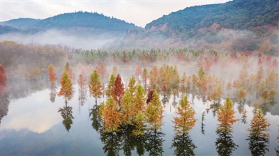 12月10日拍摄的甸尾村水杉湿地一景(无人机照片)。冬日,云南省昆明市盘龙区滇源街道甸尾村水杉湿地的水杉林色彩艳丽,景色如画。这片水杉湿地位于滇池上游、昆明松华坝水源保护区内。 ■ 新华社记者 胡超/摄