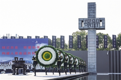 国行公祭,祀我殇胞。公祭仪式在侵华日军南京大屠杀遇难同胞纪念馆集会广场举行,现场庄严肃穆,国旗下半旗。约3000名胸前佩戴白花的各界代表静静肃立。10时整,仪式开始,全场高唱《中华人民共和国国歌》。国歌唱毕,全场向南京大屠杀死难者默哀,南京市拉响防空警报,汽车停驶鸣笛,行人就地默哀。默哀毕,在解放军军乐团演奏的《国家公祭献曲》的旋律中,解放军仪仗大队16名礼兵抬起8个花圈,敬献于公祭台上。