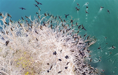 日前,在安徽省淮北市烈山区南湖湿地公园的鸟岛上,数千只野生鸬鹚云集枝头,栖居于碧水之间,构成一幅美丽的生态画卷。近年来,随着安徽省淮北市生态环境状况逐步改善,群众爱鸟护鸟意识不断提高,引来众多野生鸬鹚在湿地公园的鸟岛上栖息。 ■ 新华网 王文/摄