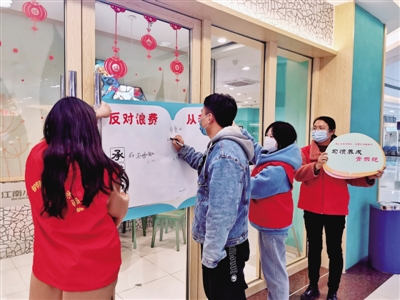 12月22日,合肥市瑶海区铜陵路街道团工委开展“青春志愿 文明合肥我助力——反对浪费 从我做起”主题活动。工作人员来到辖区食堂、餐饮店等单位,宣传人人节约粮食的重要性。活动受到居民们的欢迎。