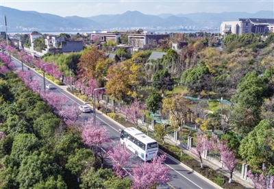 这是12月21日拍摄的昆明市红塔西路绽放的冬樱花。当日,云南省昆明市阳光明媚。在昆明市一些路段,道路旁种植的冬樱花在蓝天下绽放,美景如画。