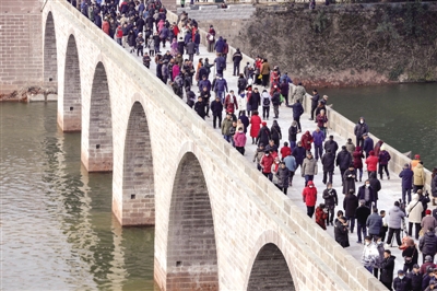 2021年12月26日,安徽黄山,市民在修缮后的明代镇海桥上通行。