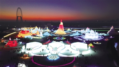 12月25日,游客在哈尔滨冰雪大世界园区游玩。当日,以“冬奥之光 闪耀世界”为主题的第二十三届哈尔滨冰雪大世界开园。本届冰雪大世界用冰用雪量为23万立方米,建造65组冰雪景观,单体景观数量超百个,通过冰雪景观、灯光特效等,打造壮美的冰雪王国。 ■ 新华社记者 王建威/摄