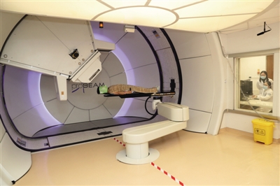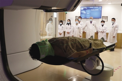 医院技术团队通过高精度患者定位和影像验证系统、笔形扫描技术,将此位骶尾部脊索瘤患者的病灶精确定位,质子束经超导回旋加速器加速后准确射入病灶,对肿瘤组织进行精准爆破,治疗全程无痛。患者进行临床试验后下床行走,并与医生、记者交流,“做梦都想不到有这么先进的治疗方法,科技发展太快了。”