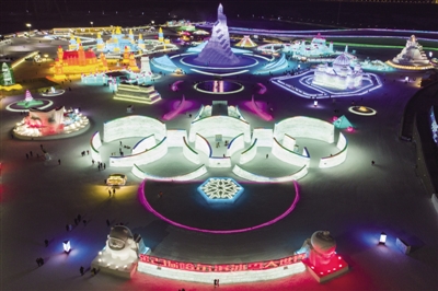 1月2日,游客在哈尔滨冰雪大世界园区游玩(无人机照片)。新年假期,冰城哈尔滨的各处冰雪景点吸引市民和各地游客前来游玩观赏。 ■ 新华社记者 张涛/摄