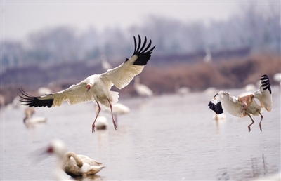新年伊始,在位于鄱阳湖畔的南昌高新区鲤鱼洲管理处五星白鹤保护小区里,来此越冬的国家一级保护鸟类白鹤展翅起舞,姿态万千。 ■ 新华社记者 万象/摄