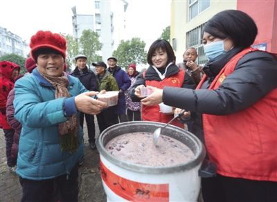 为表达对社区老人的关爱,日前,合肥市庐阳区大杨镇王墩社区妇联联合方圆社工开展“爱心腊八粥 温暖老人心”活动,社区妇联为辖区老人们熬制了一锅浓浓的腊八粥,让老人们感受到浓浓的腊八节日氛围和社区的关爱。图为庐阳区建材三厂生活小区,社区志愿者为老人盛腊八粥。