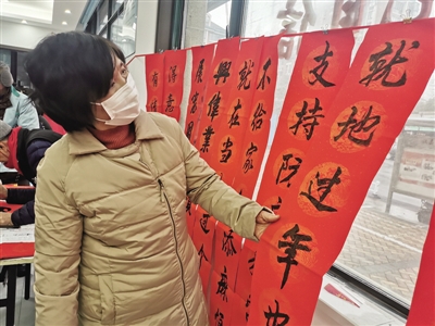 书法老师现场挥笔泼墨,凝神聚气,笔走龙蛇,一副副寓意吉祥的春联、一张张喜庆美好的“福”字跃然纸上,墨香四溢。其中,“就地过年也是年,支持防疫我当先”“今年过年不回家,留在合肥挣钱花”等一副副以“就地过年”为主题的春联,是为辖区留肥过年的“异乡人”特别订制的,并将福字、红灯笼等新春礼物一起送到辖区留肥过年的“异乡人”手中。