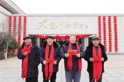 1月26日,在凤阳县小岗村,“大包干”带头人关友江(左一)、严金昌(左二)、严美昌(右二)、严立华(右一)展示自家领取的分红红包。26日,“中国农村改革第一村”——安徽省凤阳县小岗村喜迎第五年分红。至此,这个村累计分红超过1000万元。 ■ 新华社记者 曹力/摄