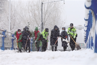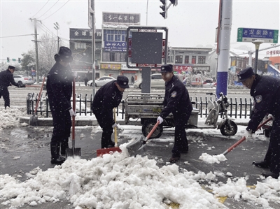 | 2月7日凌晨,肥东突降大雪,城区多处路段出现积雪现象,为切实做好雨雪天气安全管理工作,确保辖区道路交通安全,2月7日一早,肥东公安民警、辅警全员出动,铲雪执勤保畅通! ■ 张剑涛 赵汗青 |