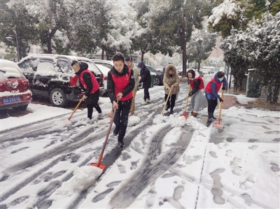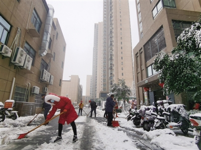 | 2月7日,合肥市滨湖世纪社区500多名党员干部、群众和志愿者纷纷响应号召,拿起工具扫雪除冰。 ■ 记者 沈娟娟 文/图 |