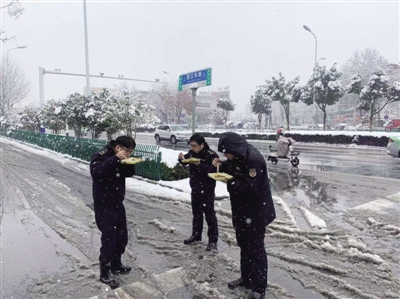 | 2月7日下午1点,在合肥市望江东路上,包河区同安街道城管队员施道鹏和队友们站在路边吃起了盒饭。当天,他们一直守在路面上,不断调配铲雪机械,遇到机械铲不到的地方,就用铁锹人工铲。为了节省时间,他和队友们站在路边顶着寒风就扒起了米饭。 ■ 毛娴静 毕莹莹 曹冰晨 记者 于彩丽 文/图 |