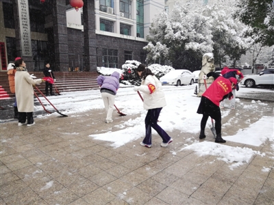 昨日,合肥市葛大店社区团总支、妇联、市容城管等部门组织志愿者积极投入到扫雪除冰作战中,他们手拿着铁锹、扫帚等工具对社居委大院和辖区道路出入口等地的积雪进行铲除,充分发挥团员和巾帼志愿者突击队的作用,为群众开辟一条平安之路。