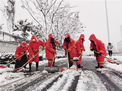 记者从合肥市城管局获悉,2月7日17时起,至2月8日5时,全市城管系统出动城管队员、环卫工人9000余人夙夜奋战,投入铲雪除冰设备385台、车辆220余台,撒布融雪剂156吨,铺设防滑垫(麻袋)1000余个,重点加大农贸市场、公交站台、过街天桥、地铁口等区域的融雪、除冰、控水防冰等工作。
