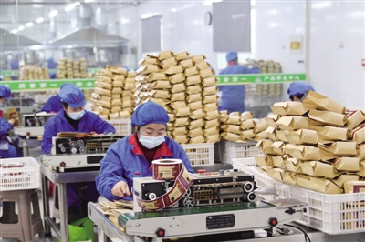 2月9日,工人在安徽省亳州市亳芜产业园区一家公司生产车间包装花茶饮料。