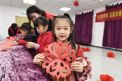 1月26日,在安徽省合肥市高新区长宁中心双河社区新时代文明实践站,小朋友展示剪纸作品。