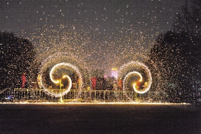 2月14日,在河南省洛阳市洛龙区隋唐城遗址植物园,民俗艺人为市民、游客表演“打铁花”,喜迎元宵佳节。随着元宵节到来,各地举行丰富多彩的活动,热热闹闹庆佳节。■ 新华社记者 韩朝阳/摄