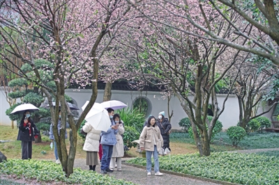市民在广西南宁市青秀山风景区观赏梅花。目前,广西南宁市青秀山风景区内的梅花盛开,吸引不少市民前来观赏。 ■ 新华社记者 周华/摄